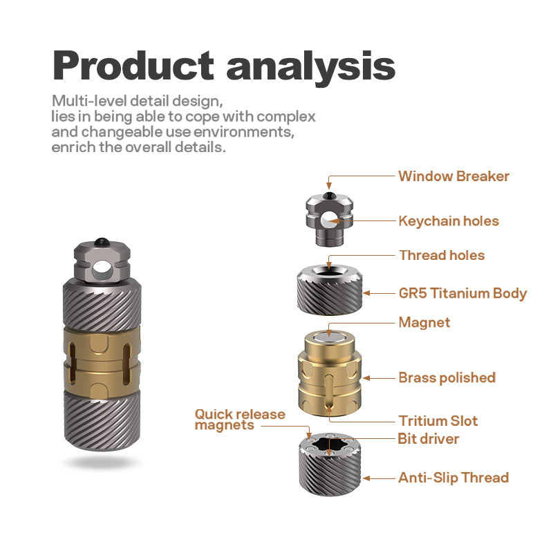 The ScrewMaster is a titanium and brass lanyard bead designed to combine style, practicality, and functionality. It features a hidden bit driver, allowing you to carry a screwdriver conveniently at all times. The bead is versatile, suitable for use on a keychain, as a necklace, or attached to tools. Additionally, it includes four tritium slots for easy visibility in the dark.